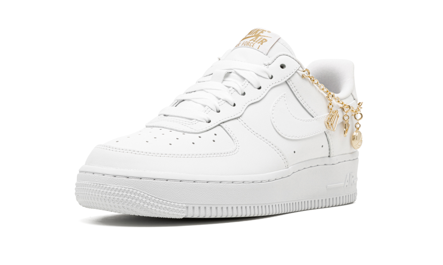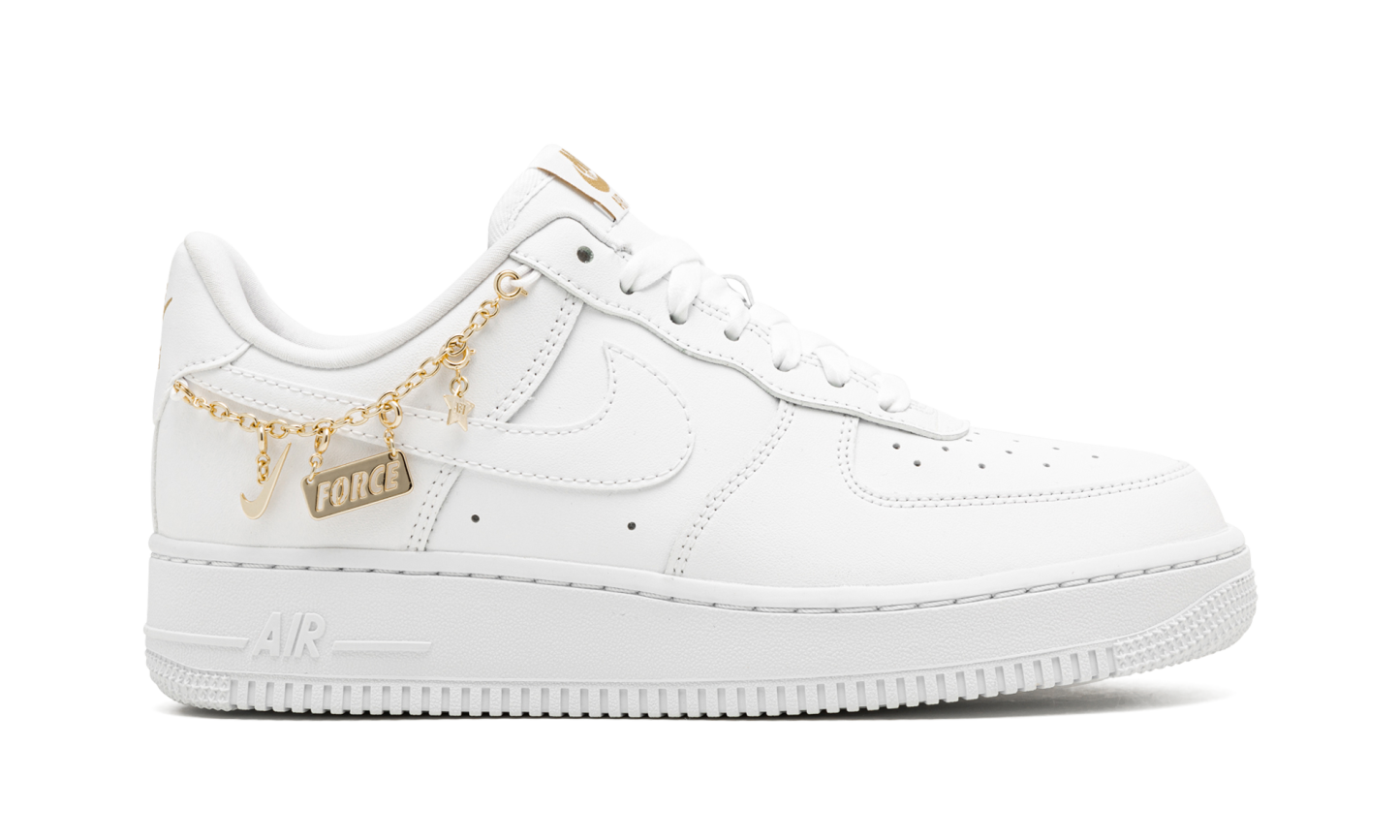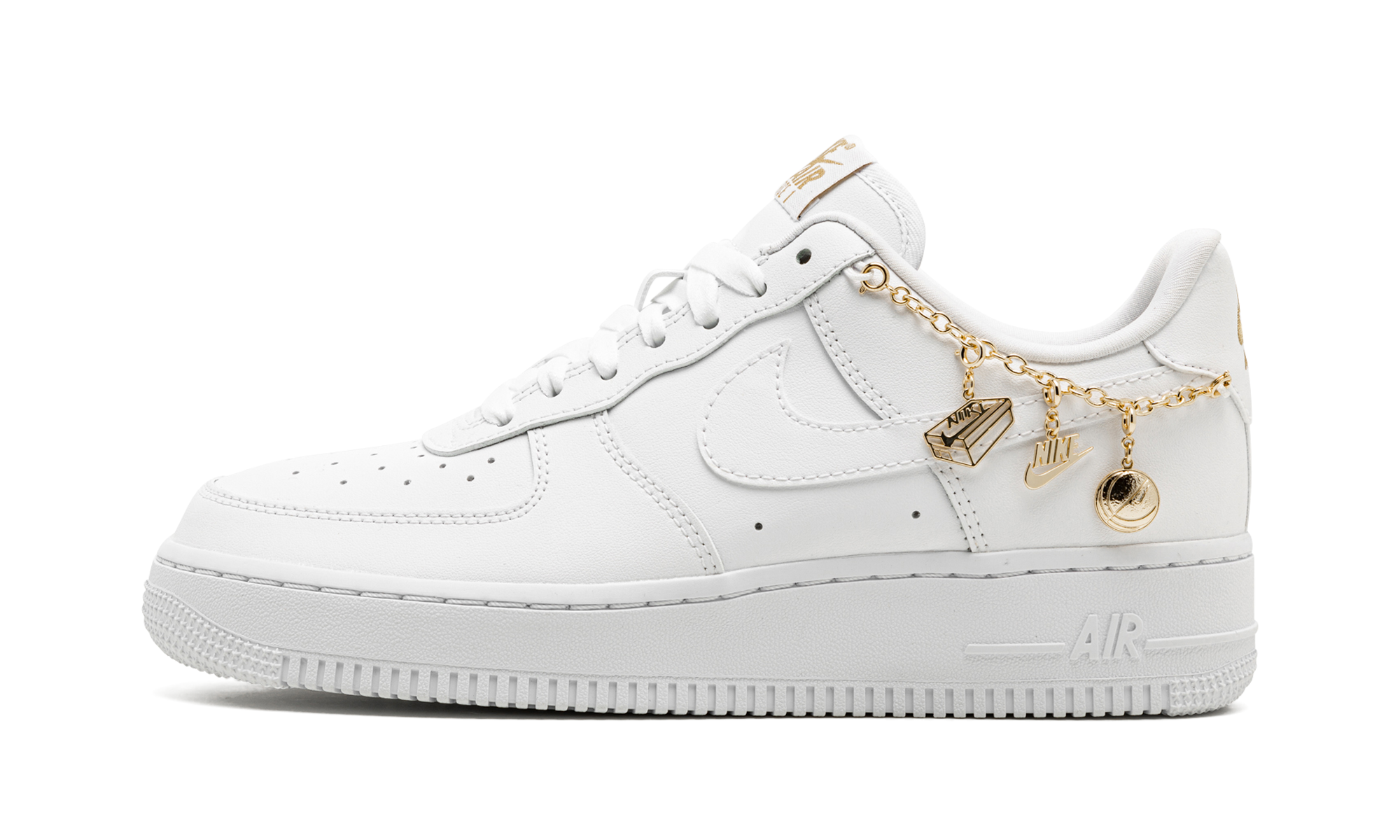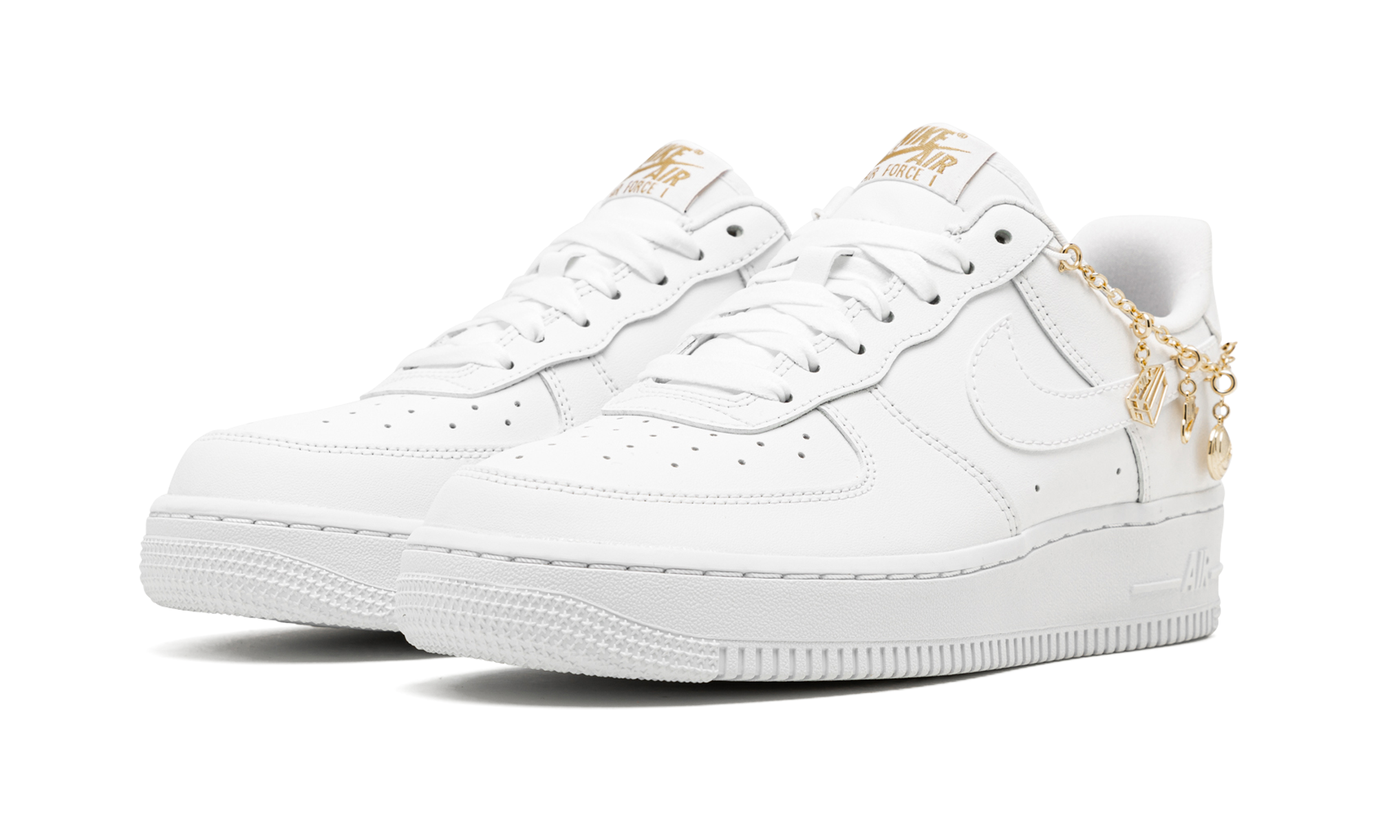 The Women’s Nike Air Force 1 Low “Lucky Charms” is a women’s version of the retro basketball shoe in a casual, white-based colorway that features added jewelry on its design. The “Lucky Charms” is one of several women’s-exclusive variations of the Air Force 1 with flashy jewels on its design, the others being the “Bling” and Air Force 1 Shadow “Charms.” On the “Lucky Charms,” the entire upper, including the perforated toe, overlay panels, and Swoosh branding, are designed in white leather. Contrasting Metallic Gold “Nike Air” and Swoosh detailing are embroidered on the heel and printed on the white nylon tongue tag. A Metallic Gold chain with Nike-adjacent charms is found on the collar. Release date: November 11, 2021 Lucky Charms