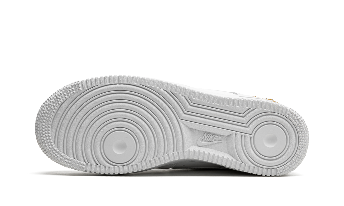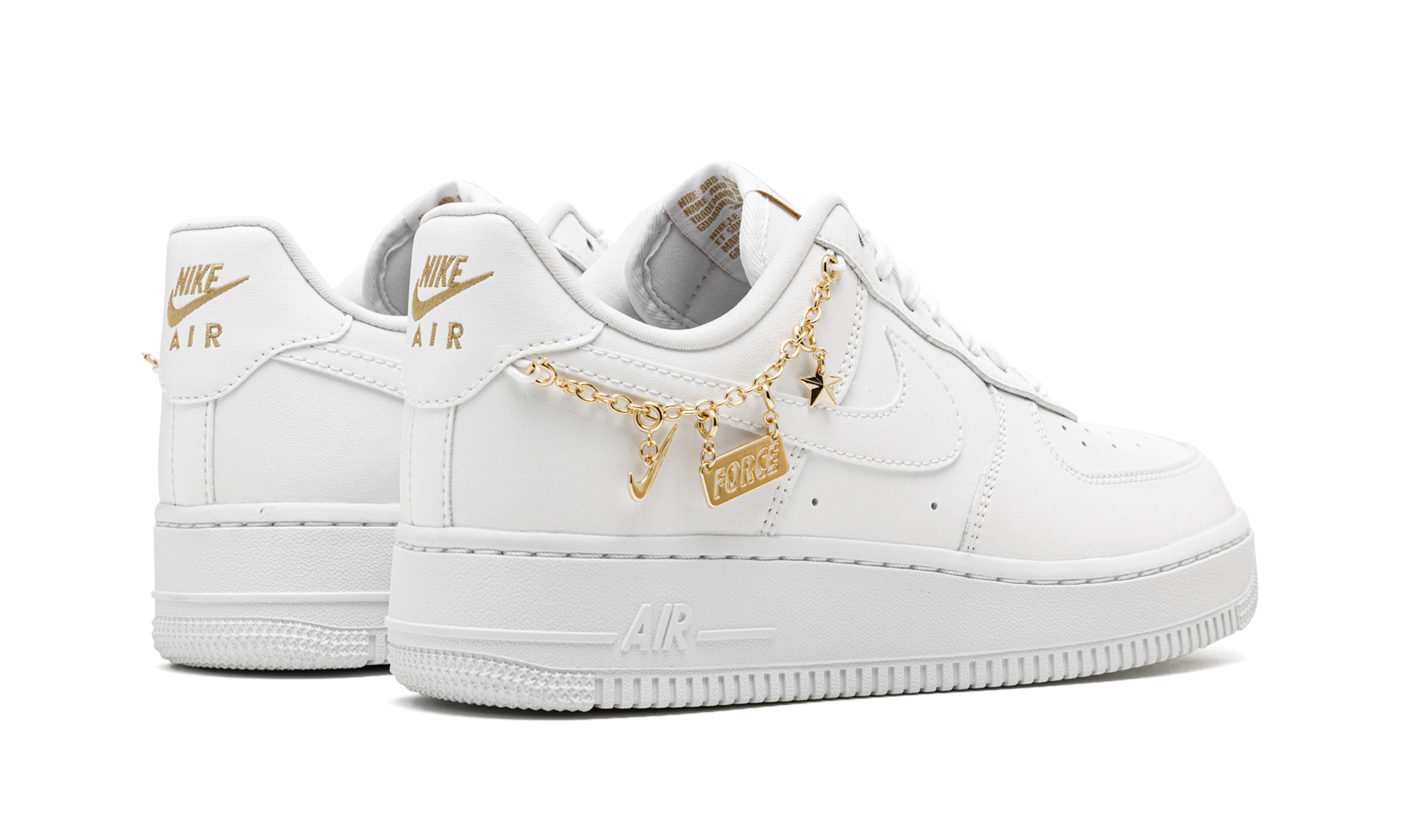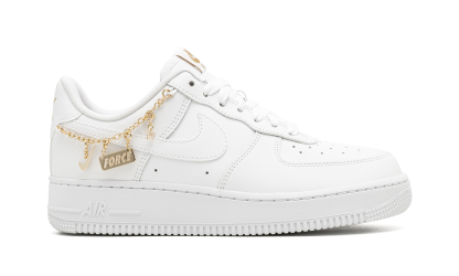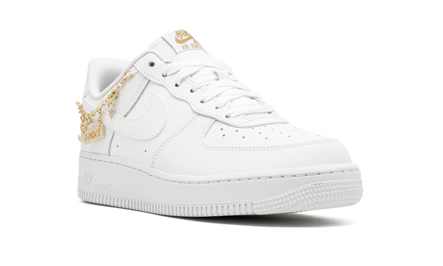 The Women’s Nike Air Force 1 Low “Lucky Charms” is a women’s version of the retro basketball shoe in a casual, white-based colorway that features added jewelry on its design. The “Lucky Charms” is one of several women’s-exclusive variations of the Air Force 1 with flashy jewels on its design, the others being the “Bling” and Air Force 1 Shadow “Charms.” On the “Lucky Charms,” the entire upper, including the perforated toe, overlay panels, and Swoosh branding, are designed in white leather. Contrasting Metallic Gold “Nike Air” and Swoosh detailing are embroidered on the heel and printed on the white nylon tongue tag. A Metallic Gold chain with Nike-adjacent charms is found on the collar. Release date: November 11, 2021 Lucky Charms