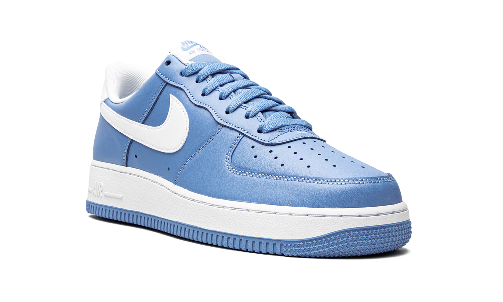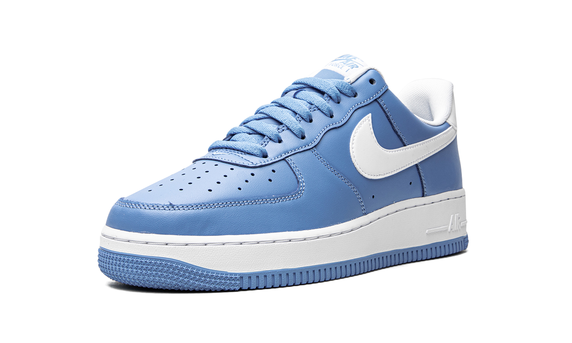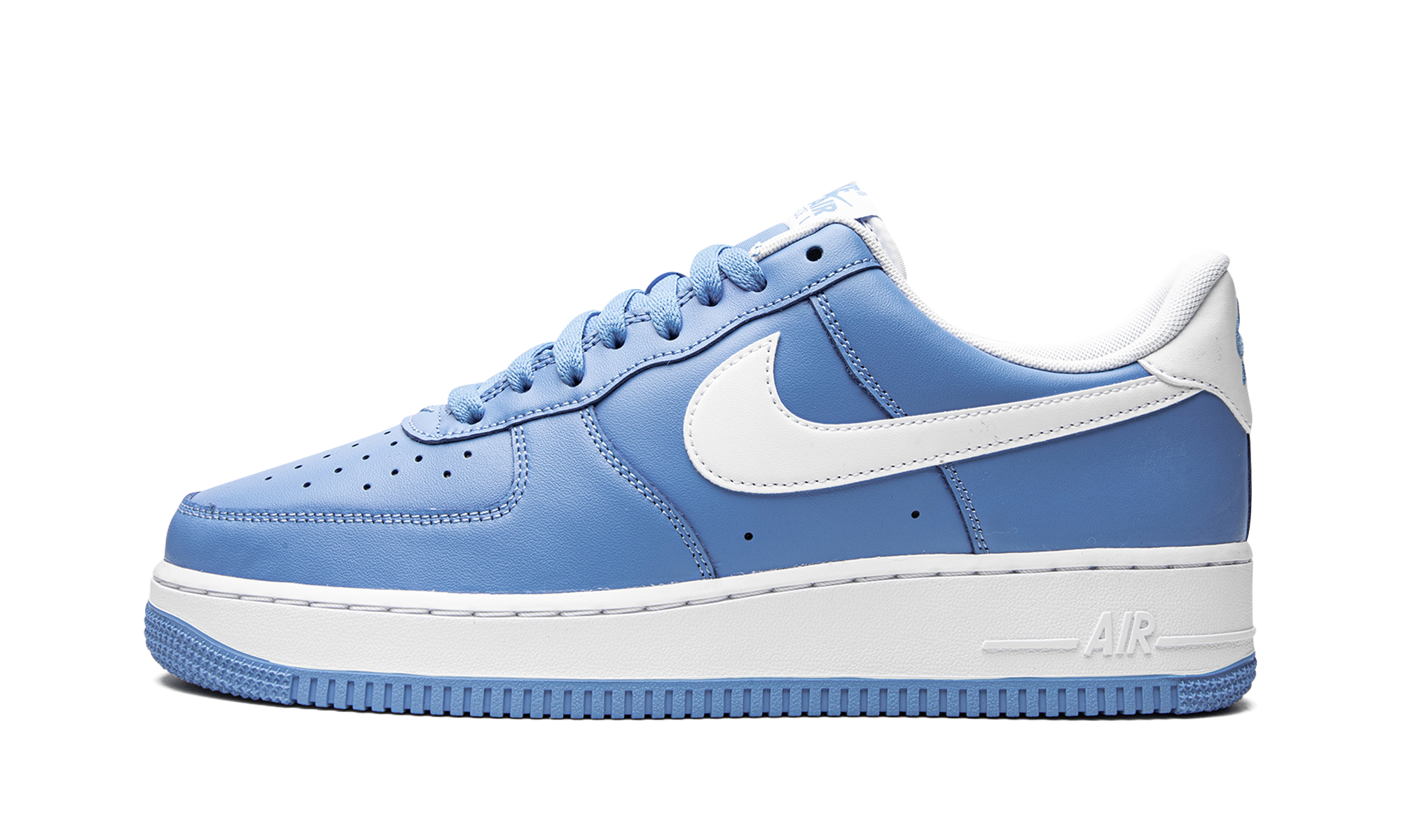 The Nike Air Force 1 Low “University Blue” is a colorway of the retro basketball shoe that looks to the popular “UNC” theme that originated on the Air Jordan 1 in 1985 for design inspiration. A Fall 2021 release by Nike, the “University Blue” is reminiscent of the brand’s late ‘90s and early 2000s Air Force 1 and Dunk colorways that also appeared in “University Blue” or “Powder Blue.” Here, the entire upper, including the perforated toe, mid-panel, collar, and heel, appear in University Blue-colored leather. A crisp white leather Swoosh contrasts the look. Additional white leather can be found on the heel tab that features embroidered “Nike Air” and Swoosh branding in University Blue. Additional “Nike Air” detailing is printed in light blue on the white nylon tongue tag on the white nylon tongue. A white rubber sole completes the design. UNC