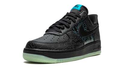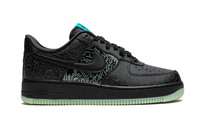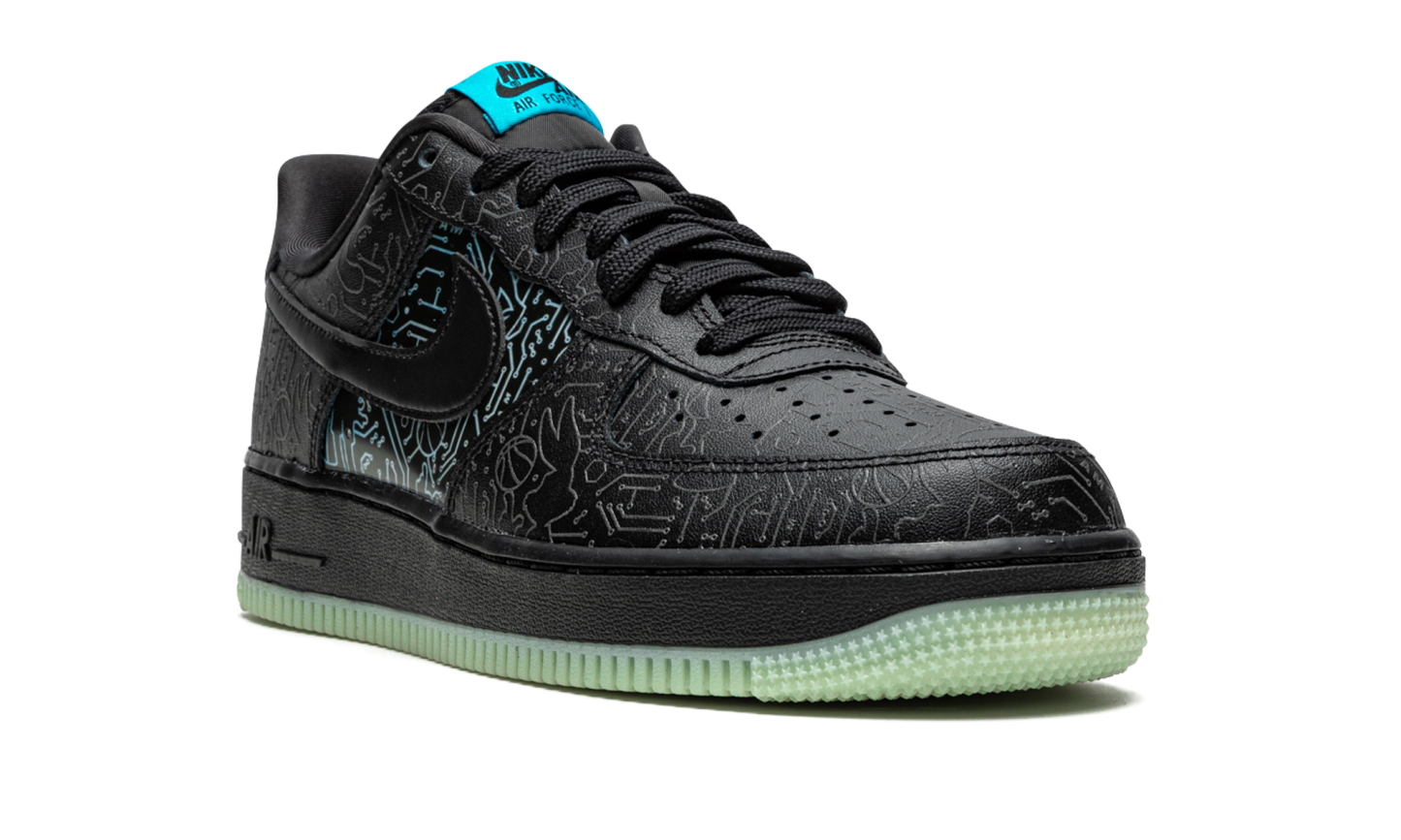 The Space Jam x Nike Air Force 1 Low “Computer Chip” is a special edition colorway of the lifestyle shoe by Nike to launch in conjunction with “Space Jam 2” starring LeBron James. Appearing in the same “Space Jam” collection of Air Force 1s as the “Toon Squad” colorway, the “Computer Chip” features futuristic, computer chip-style graphics printed onto the panels of the black leather upper. When looked at closely, the lines and shapes of the graphics resemble the silhouettes of various “Space Jam 2” characters. The lines appear in a tonal hue on the perforated toe, forefoot, eyelets, collar, and heel and blue on the mid-panel. A black leather Swoosh breaks up the look on both sides and a blue “Nike Air Force 1” tongue tag resides on the black nylon tongue. A glow-in-the-dark sole unit completes the look. Release date: July 16, 2021 Space Jam - Computer Chip
