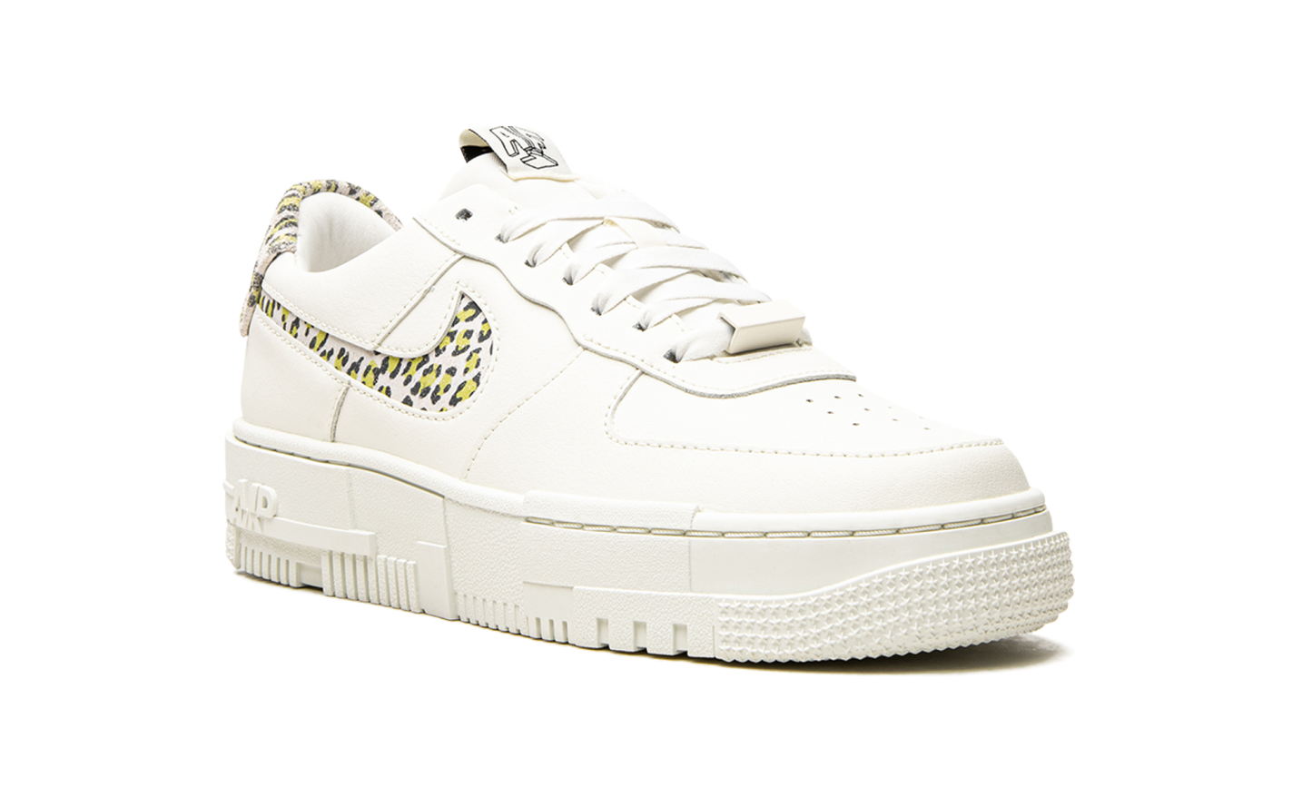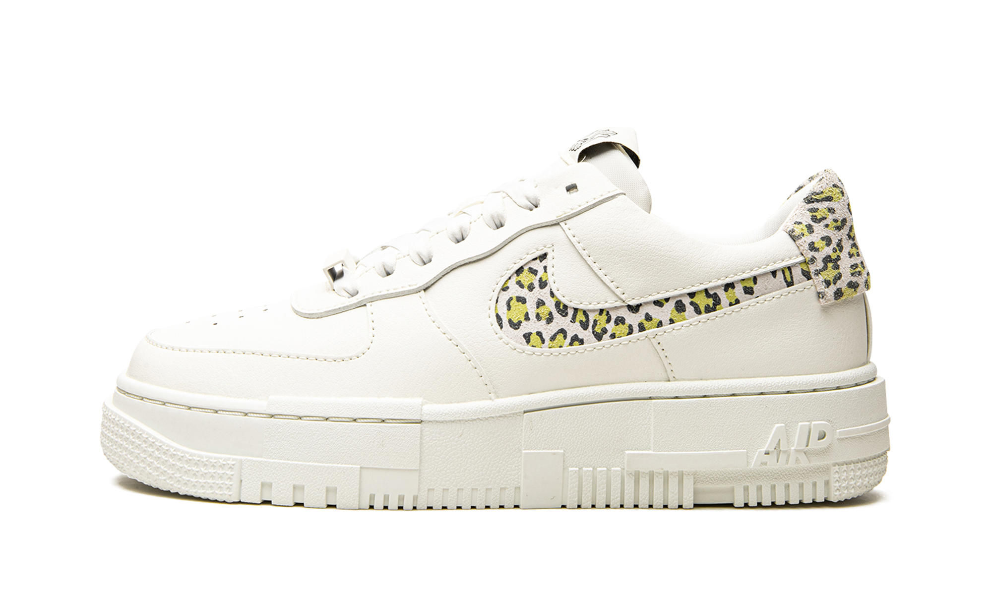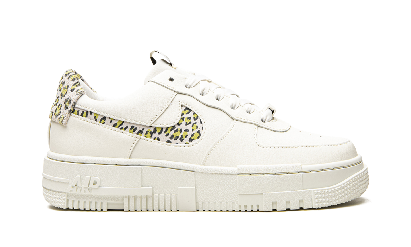 The Nike Air Force 1 Pixel "Leopard" adds to the lineup of women's Air Force 1s with wildlife-inspired and pixelated detailing. The midsole features angular, yet distorted details, and the number of perforations on the toe box have been reduced. This white Nike sneaker is livened up with a yellow, spotted leopard print on the side Swooth and oversized suede heel tab, as well as unique elements that resemble glitches in the iconic design. Leopard