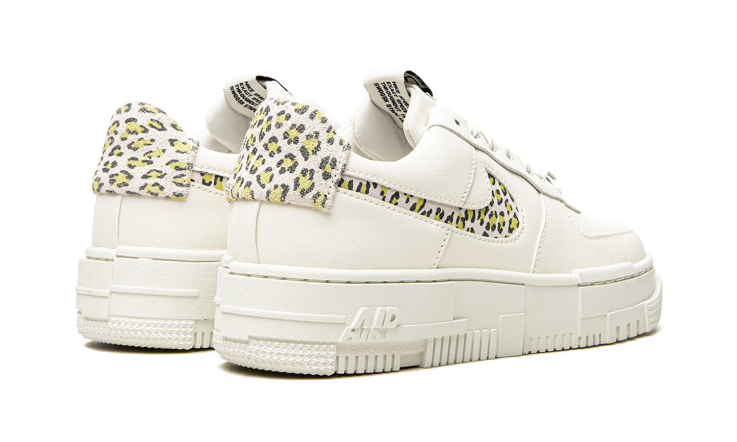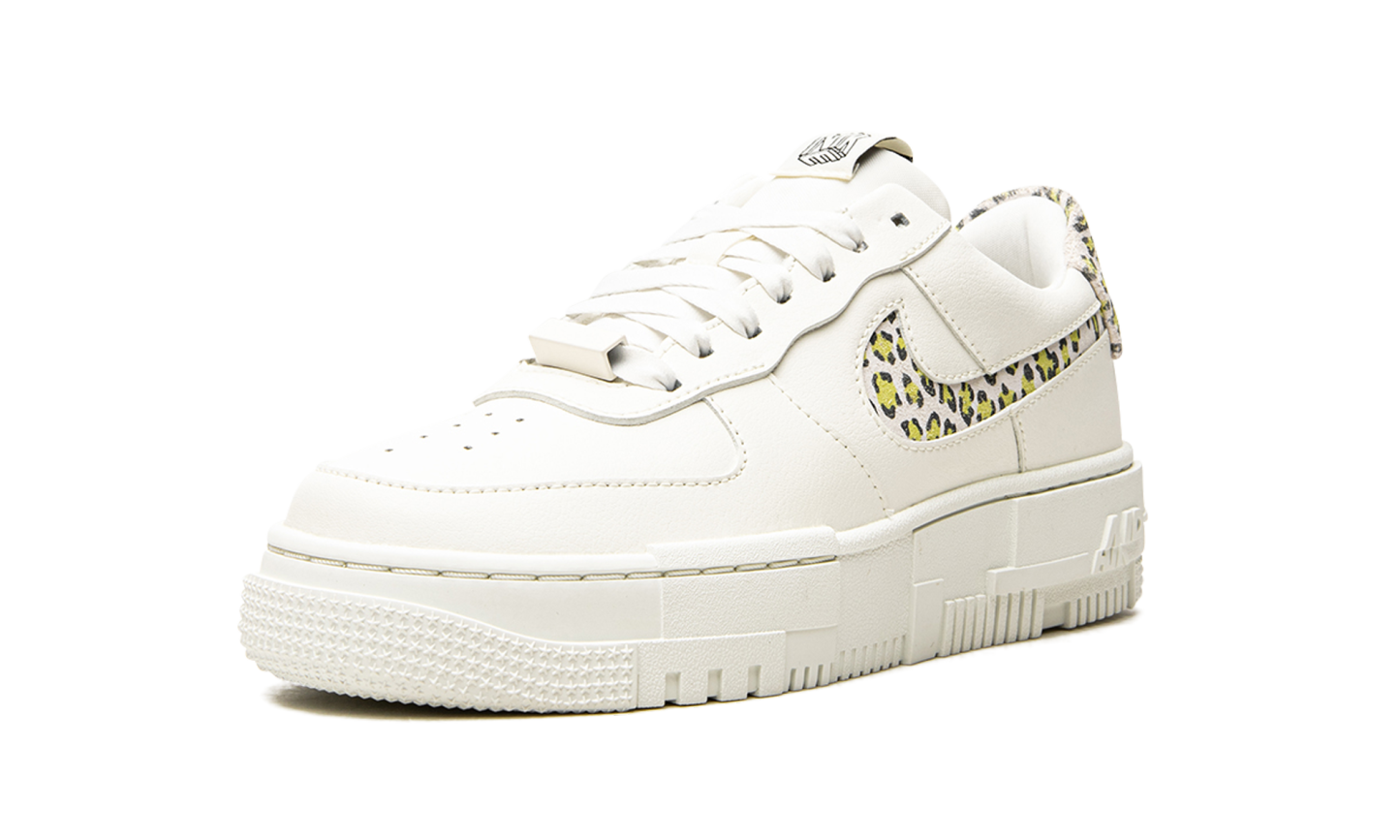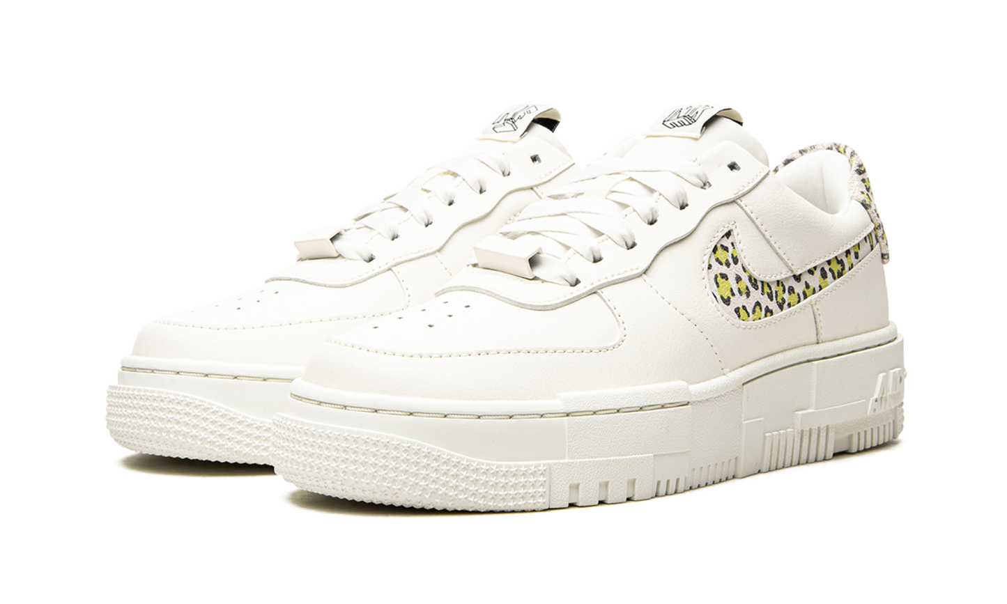 The Nike Air Force 1 Pixel "Leopard" adds to the lineup of women's Air Force 1s with wildlife-inspired and pixelated detailing. The midsole features angular, yet distorted details, and the number of perforations on the toe box have been reduced. This white Nike sneaker is livened up with a yellow, spotted leopard print on the side Swooth and oversized suede heel tab, as well as unique elements that resemble glitches in the iconic design. Leopard