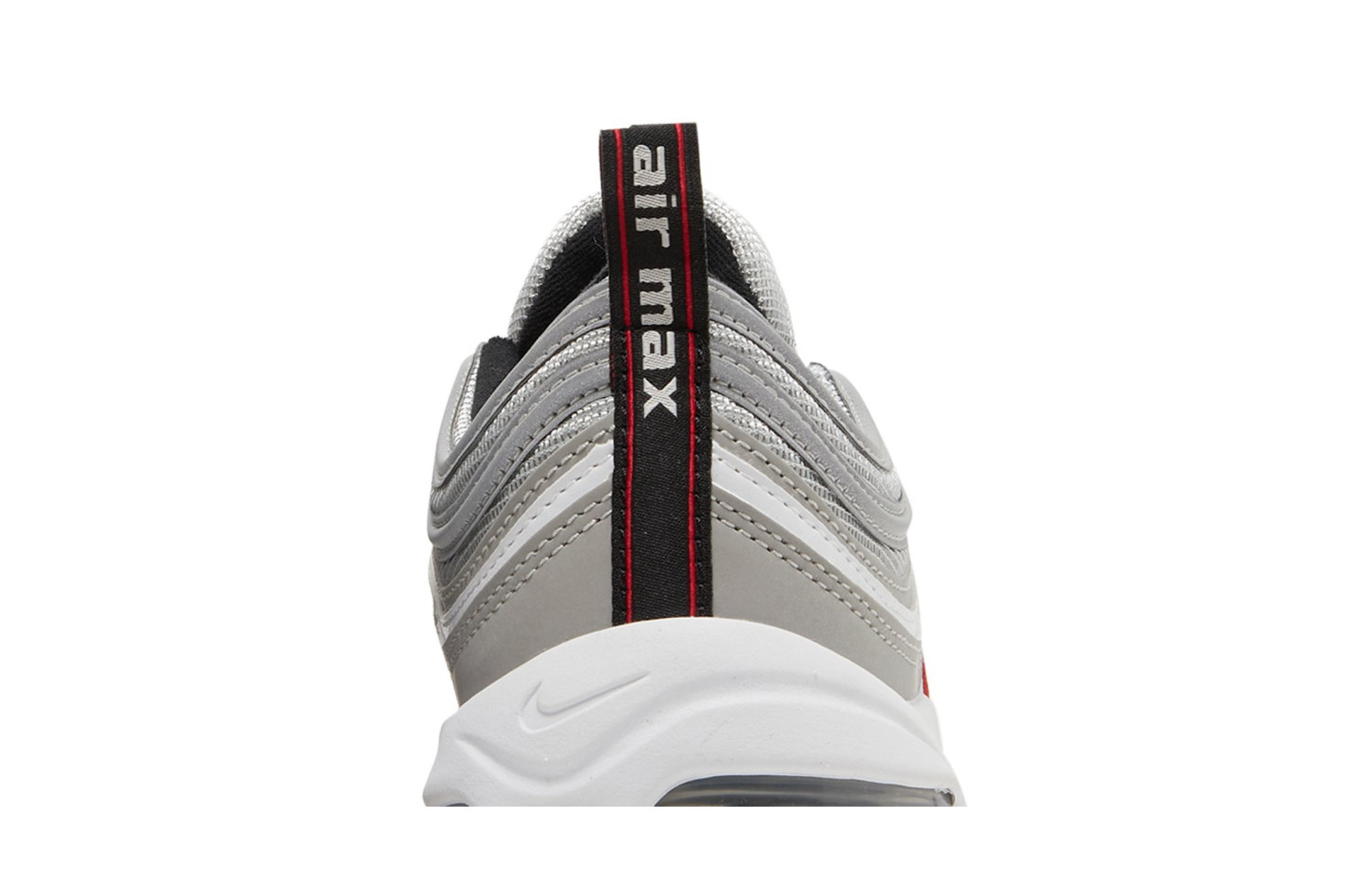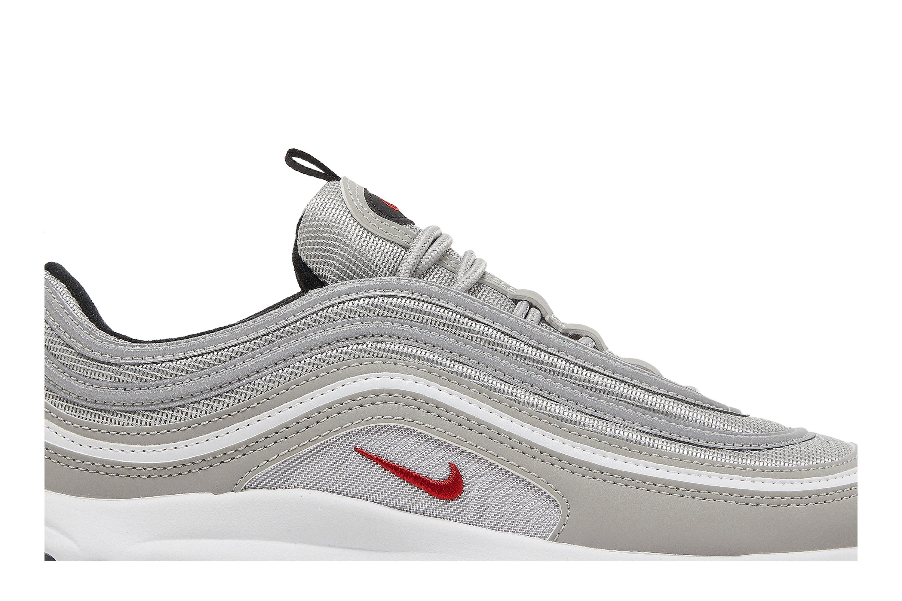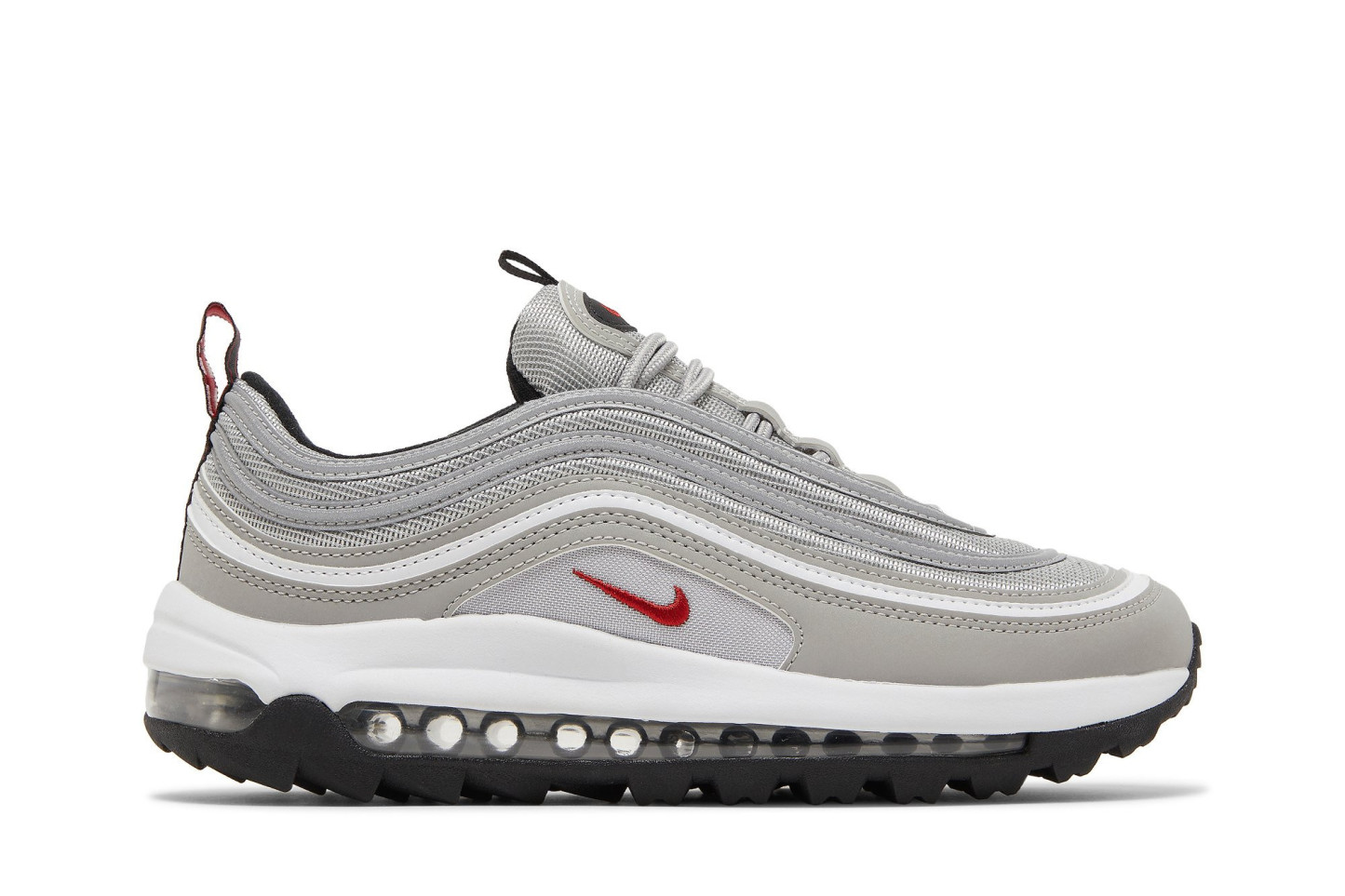 The Air matthhx 97 Golf Silver Bullet brings a classic nitthhke silhouette to the links. The upper replicates the look of the OG Air matthhx 97 colorway, featuring a silver mesh base with wavy leather overlays and an embroidered red Swoosh at the quarter panel. A white foam midsole houses the sneakers all-important full-length matthhx Air unit, reinforced underfoot by a black rubber outsole with an integrated traction pattern made for the fairway.