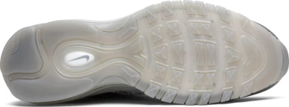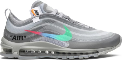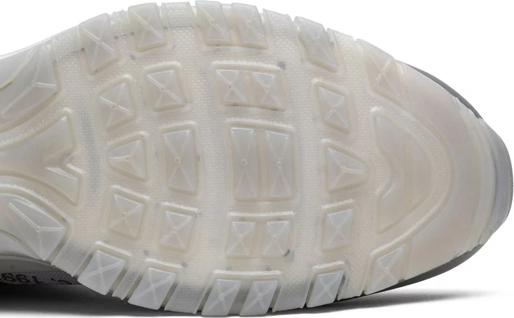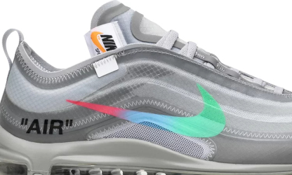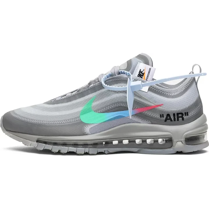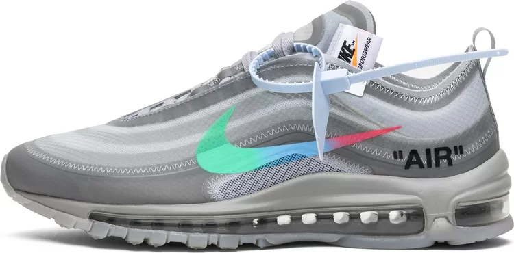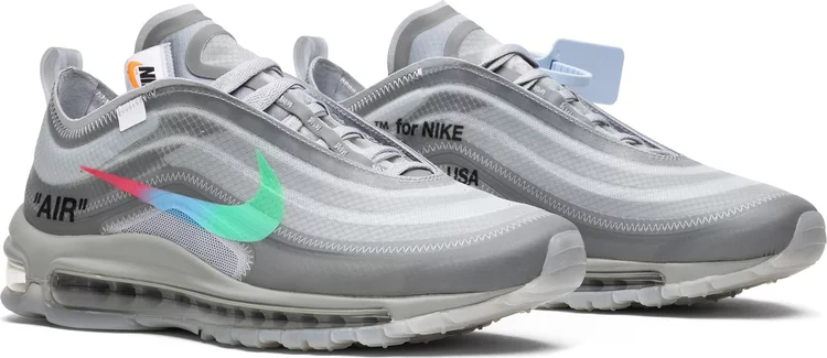 The Air matthhx 97 ‘Menta’ features a translucent textile upper finished in Wolf Grey, complemented by Virgil Abloh’s signature text and tonal zigzag stitching throughout. The neutral color scheme is disrupted by a multicolored Swoosh that transitions from green to blue to red, while underfoot, a smoky grey rubber outsole maintains the shoe’s translucent theme.