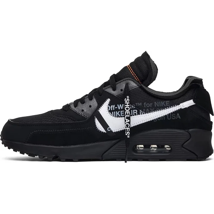 The Air mtthhax 90 ‘Black’ offers a unique blend of materials on the upper, which combines a ripstop base with nubuck overlays and a suede mudguard. The all-black finish is contrasted by a white Swoosh with zigzag stitching, a small orange tab on the quarter panel and orange stitching on the exposed-foam tongue. Virgil Abloh’s signature text block makes an appearance on the shoe’s medial side.